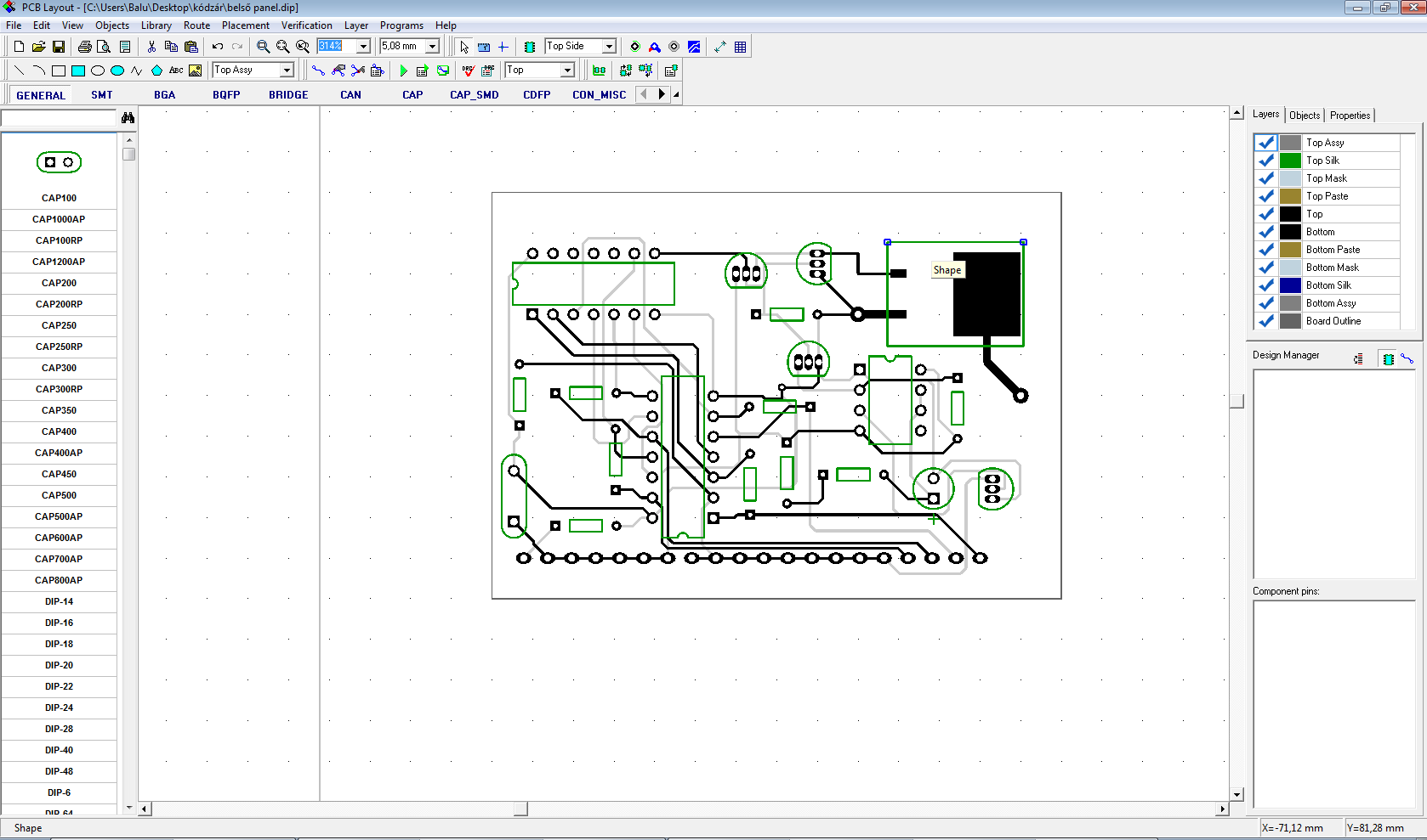 Letöltöttem a mellékelt dip filet, de nálam nem lehet például alkatrészt kijelölni. Ellenben mintha alkatrész szerkesztőben lennék, minden alkatrészhez tartozó elemet (vonalat, ívet, pontot stb) ki tudok jelölni a paneltervezőben. Valami nem kerek a boarddal. Esetleg az összes alkatrész egyedileg rajzolt és nálam nincs meg a libraryban?