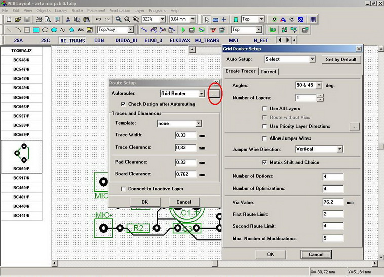 Grid routernél: Route-Route setup-Autorouter: Grid Router kiválaszt majd mellette a három pöttyre katt-Use all layers pipa ki- Number of layers 1-Allow jumper wires, ha kell átkötés, melynek iránya megadható a Jumper wire direction opciónál.
