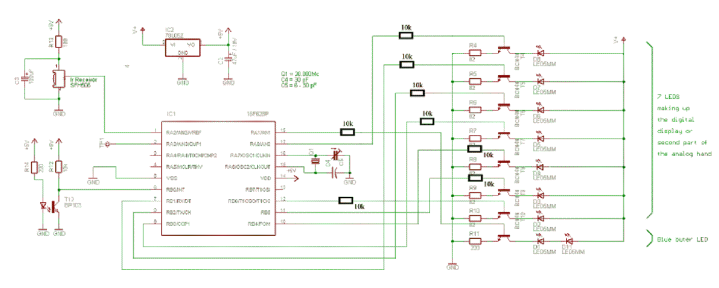- Az eredeti Propeler Clock programja és a bázis program is 1 az 1-ben használható! A LED-ek bekötése fentröl lefelé. (A 7 szegmens), a PIC lábairól: 12,11,10,9,8,7,17. A 18. lábról a "keret" LED-je köthetők be: Legfelül az egyik, és legalul a másik, tisztes távolságra a kijelző LED-jeitől. Azt hiszem elég egyértelmű lett a LED-ek bekötése. Szia.