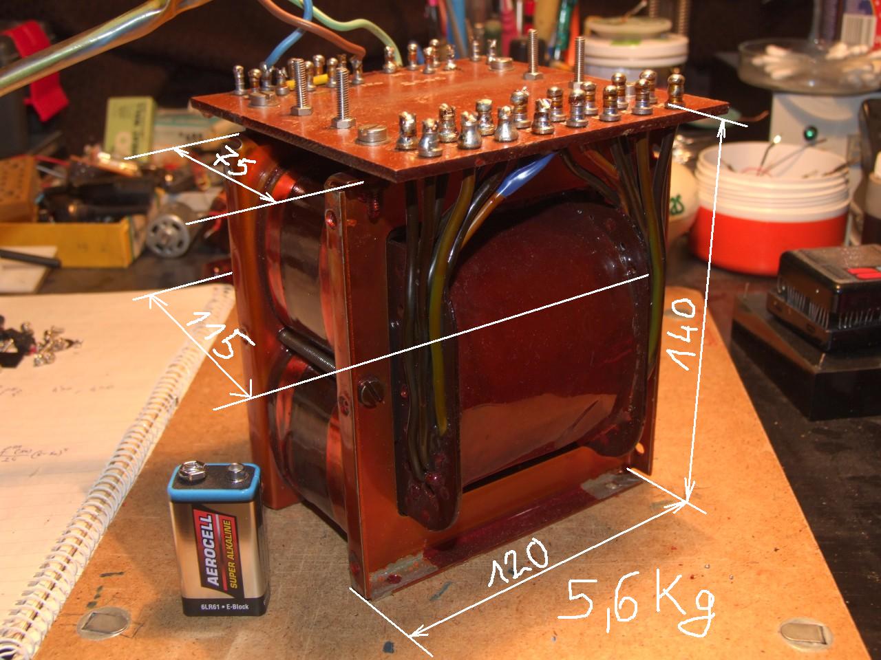 A kisebbik trafo egy toroid külső átmérő: 110mm, belső átméő: 35mm, magasság: 4 mm, primer: d=0.5mm, szekunderek (2x9V): d=2mm és 1.9kg.