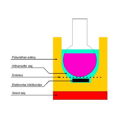 A te igényed (barátodé) egy kémia laborban használható, üvegedény melegen tartót, ami kevés energiát fogyaszt, kívülről melegíti az edényt, 60C környékén hőfokra beállítható, nem nagyon zavarja a kémiai folyamatokat, biztonságos és rázható. Kevés energiafogyasztás úgy oldható meg, ha minimalizáljuk a veszteségeket. Az edényt a lehető legjobb hőátadással melegítjük: Ez valamilyen folyadékba merítéssel oldható meg. A hő közvetítő folyadék térfogata a minimális kell legyen, és az üzemi hőfokon ne nagyon szenvedjen fázisváltást, (párolgást) mert az sok energiát von el. Ezeknek a szempontoknak, szerintem valamilyen magasabb lobbanáspontú olaj felel meg leginkább. Lehet, hogy nem baj, ha szilikon olaj, mert az nem nagyon vesz részt a szénalapú reakciókban. (Ezt majd a kémikus jobban tudja, lehet alkalmazásonként eltérő anyag is.) A melegítőt a külső oldalon hőszigeteljük. A 60C környékén talán még lehet műanyag hab is. A poliuterthan hab nagyon ellenálló zárt cellás és könnyű. A villamos energia / hőenergia konverzióhoz, a Kapcsolások ť Ventillátor hőfok-vezérlése Szerző: proli007, idő: Okt 30, 2008-féle megoldás átdolgozott változatát tartom egyszerűnek és célszerűnek. A fűtőegység maga a FET lehetne, kiegészítő áramköri elemeivel együtt önszabályzó módon, egy kis közös hűtőbordán felépítve, mindenestül belemerítve a hő közlő folyadék aljába. Így minden hővé alakult „veszteség” hasznosul. Maga a szabályzás így még hőtranszfer folyadék nélkül is biztonsággal üzemelhet. A rázás-lötykölés a nehéz talp és a pur edény között lenne megoldható, esetleg az ülegedény nyakánál fogva.