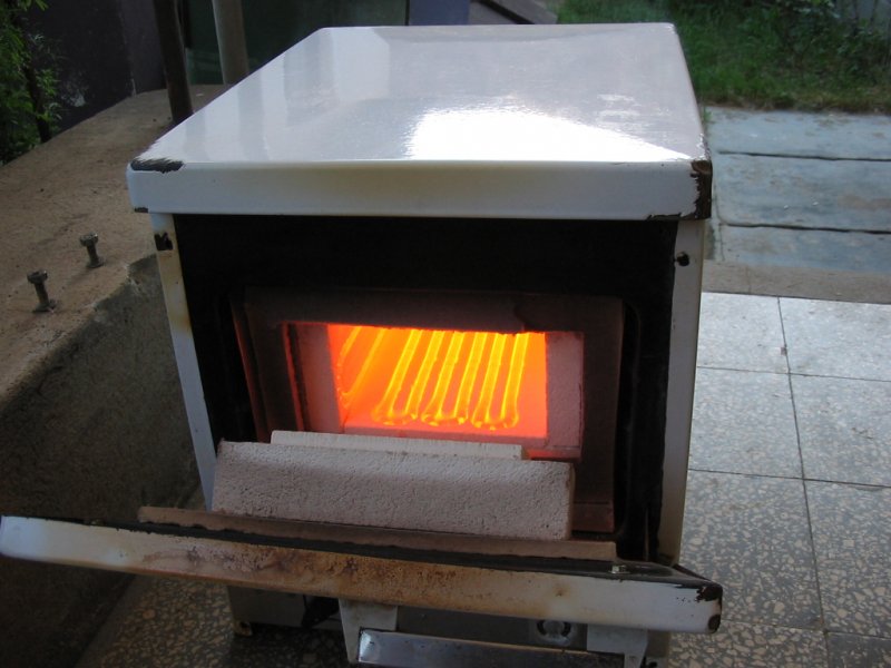 Kisebb frekvencián is vannak örvényáramok (bármilyen fémben, nem csak a mágnesezhetőkben!), könnyebb a megvalósítás, sokkal kisebb a zavar, könnyebben szűrhető. Az előzőekben linkelt, megvalósított kapcsolások is párszáz kilohertz környékén működnek. Esetleg érdemes azon elgondolkodni, hogy feltétlenül szükséges-e az indukciós módon történő hevítés. "Sima" ellenálláshuzallal sokkal kevesebb műszaki problémával, közönséges hálózati feszültségről is lehet jó kis kemencéket csinálni. A mellékelt képen egy kb. 1,5 kW-os saját készítésű tűzzománcégető kemence látható. 800-1000°C-ig megy, 2-3 óra alatt fűt fel, egy fázisról működik.