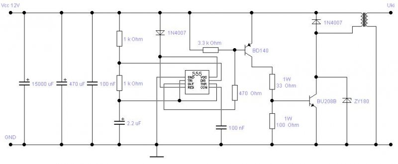 Akkor ebből az derül ki elsősorban,hogy az 555 nem képes meghajtani rendesen a tranyót. Még annyit próbálj,hogy a 43ohm-ot kösd rá a bázisra,ezenkivül 220ohm ellenállást a bázis és a test közé,a gyújtótrafót is kösd az izzók helyére,és kézzel az ellenállást a pozitiv tápfeszhez érintgetve nézd meg mekkora a szikra.