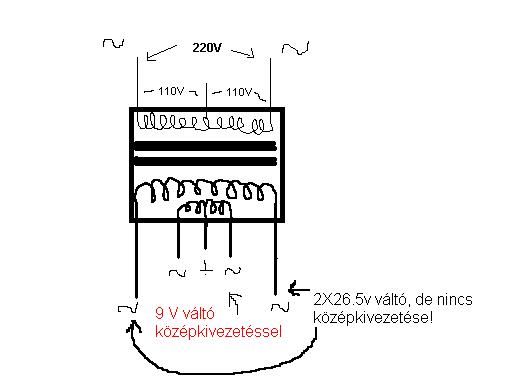 Jó lenne, ha a tekercskapcsolatokat lerajzolnád, mert így nem egyértelmű. Ezt Ohm -mérő állásban ki tudod mérni , ~V állásban a multiméter olyat is mér, ami a "valóságban" nincs. Ha középre rajzolt vezeték csak a 9V közepe, akkor mihez képest van 2x26,5V-od?