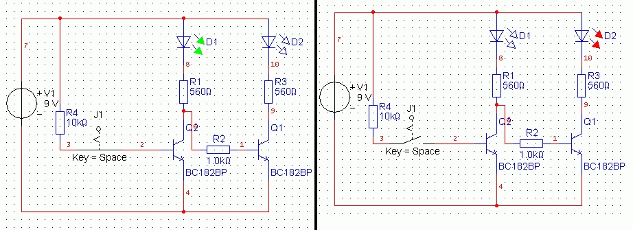 A te rajzod így biztosan nem jó, mert a piros LED nyitófeszültsége kisebb mint a zöldé, tehát a Q2 tranzisztor nyitásakor nem történne semmi változás a LED-ek állapotában. Ki lehetne hozni belőle valamit, de a földelt kollektoros kapcsolás nem a legcélszerőbb erre. deguss rajza már közelít, de érdemes a Q2 B és E közé egy nagy ellenállást betenni (100k) és az R2 értékét is meg kell növelni (10k), mert a D1 LED 9V-ról 1,56 k-n keresztül még világítani fog. És az R4-et sem szabad kihagyni az áramkörből! Üdv.