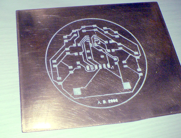 Ebből szürkeárnyalatos képet kell csinálni. Ennek a képnek szintjeit széthúzni, (valószínüleg jobb lett volna, ha a feketét nem 0%-ra, hanem egy kicsit szürkébbre állítom). Aztán ebből készült negatív kép. Utána a képmódot átállítani bitmap-re, vagyis kétszínűre, (ha jól emlékszem 600 dpi-s felbontással és 15 vonal/inch raszterrel csináltam, de ezt próbálgatni kell). Az így elkészített képet lehet vasalni. Az utolsó trükk annyi, hogy a tonert csak annyira mostam le a kész nyákról, hogy a feketeség beüljön a lemaratott részekre, így lett szép kontrasztos a végeredmény. Utána lakkozás és kész.