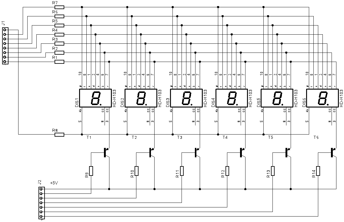 No igen, lehet, hogy érdemes lenne nagyobb áramú meghajtást tervezni a szegmensekhez is. Az 1/6 multiplexelésnél lehet nagyobb csúcsáramot használni, mint amivel statikusan tudna az adott LED világítani. Meg kell persze nézni az adott LED adtlapját, de egy 20mA-ről normálisan világító típusnál nem lehetetlen csúcsban 50-100mA környékére is felmenni.