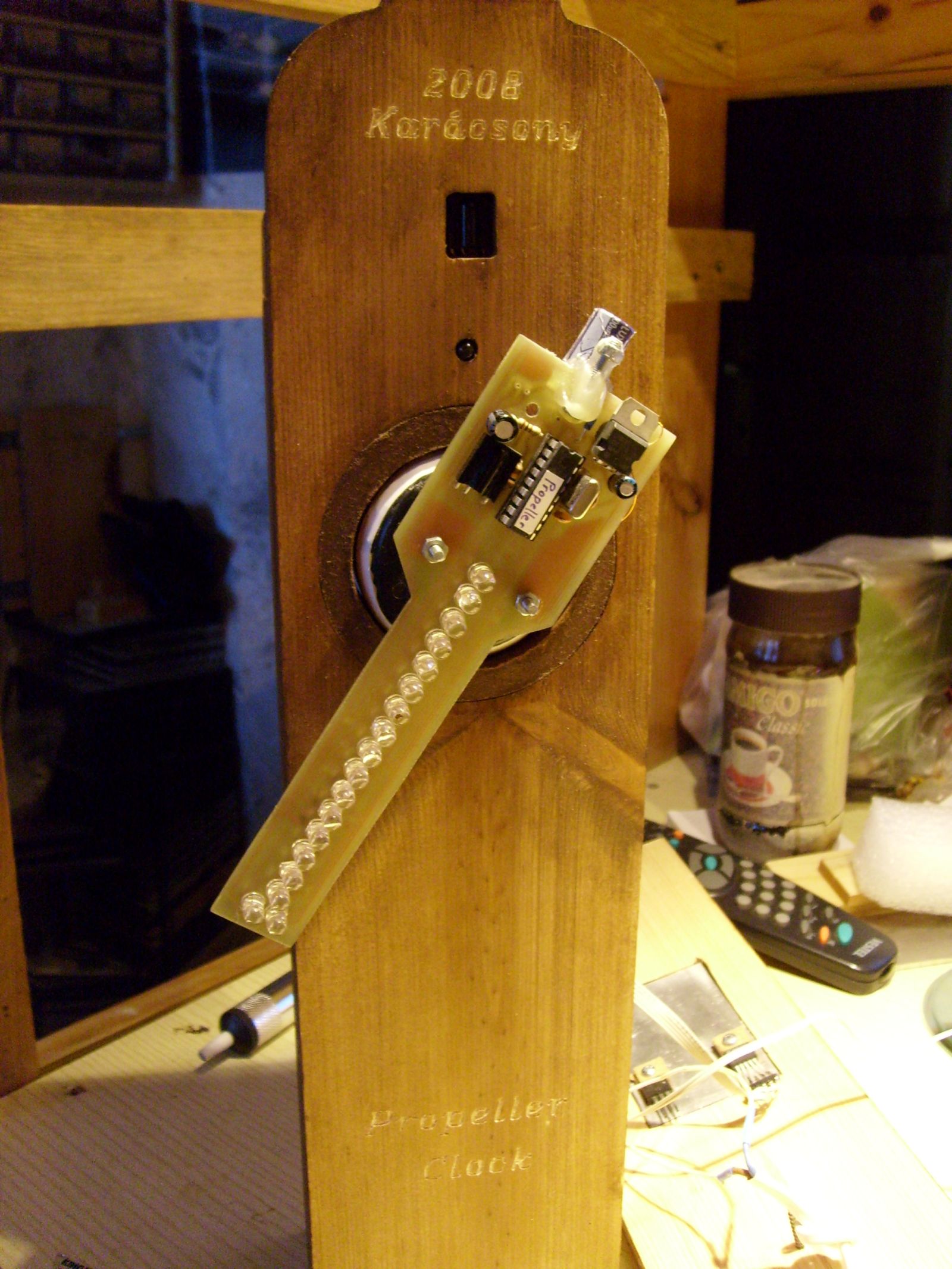 Most látom hogy zsuscsinyo is Propeller Clockot mutatott be,én is egy ilyennel jönnék most a nagyközönség elé.Az a másodperckijelzés egyszerűen fantasztikus,a következő órámhoz szeretném felhasználni ha szerzői jogok nem védik és szabadon terjeszthető... ![]() Gratulálok hozzá! És akkor most jöjjön az én 'kicsikém',a 'hagyományos verzió,nem smd kivitel. Várom a véleményeket,ki mit szól hozzá. A gravírozás mutatja hogy mikorra is készült,éppenhogy be tudtam fejezni. Sajnos a ventillátor kell rá mert (a PC topicban látszik) akadt egy kis problémám a légréssel és melegszik a fet.Boldog Karácsonyt Mindenkinek!