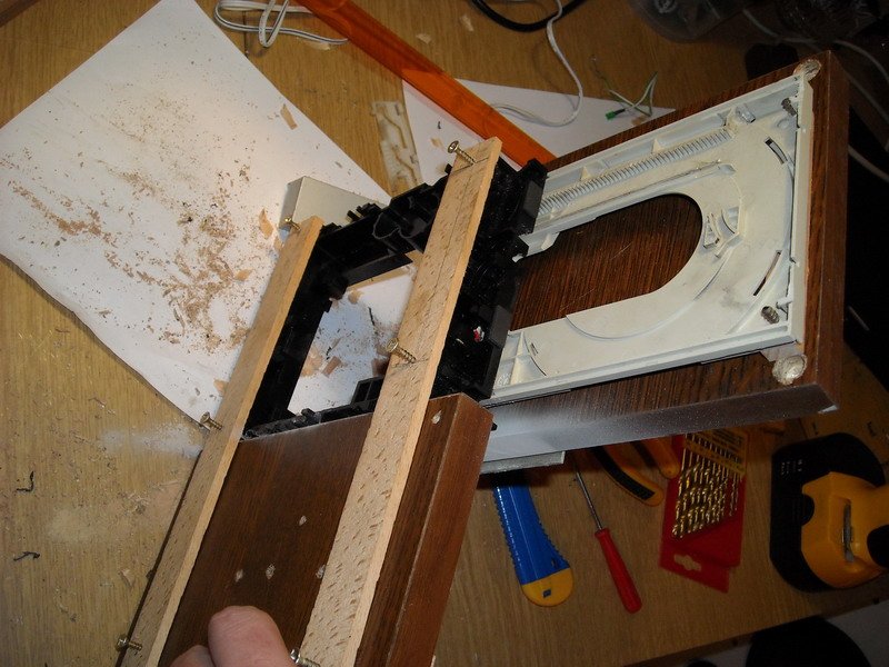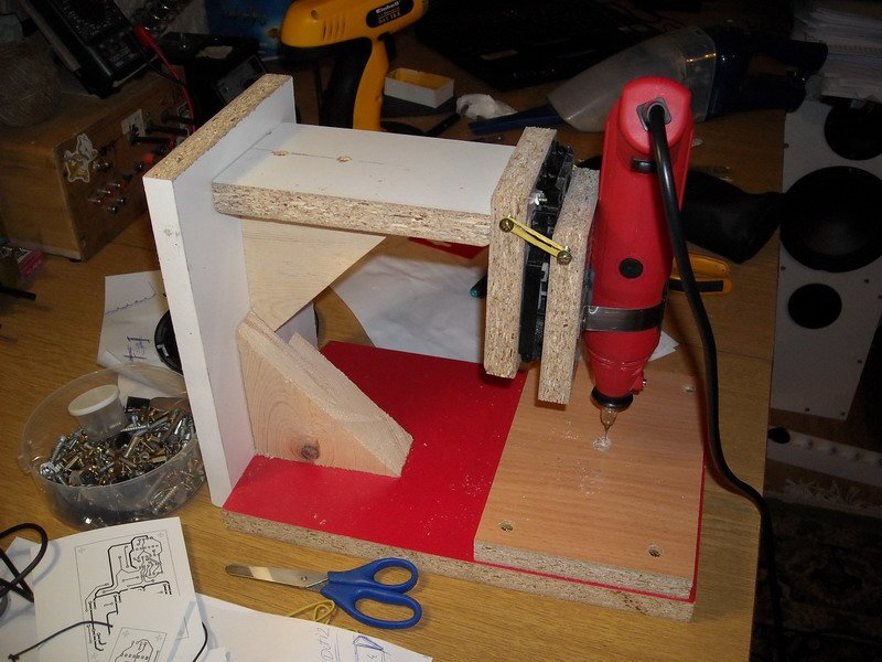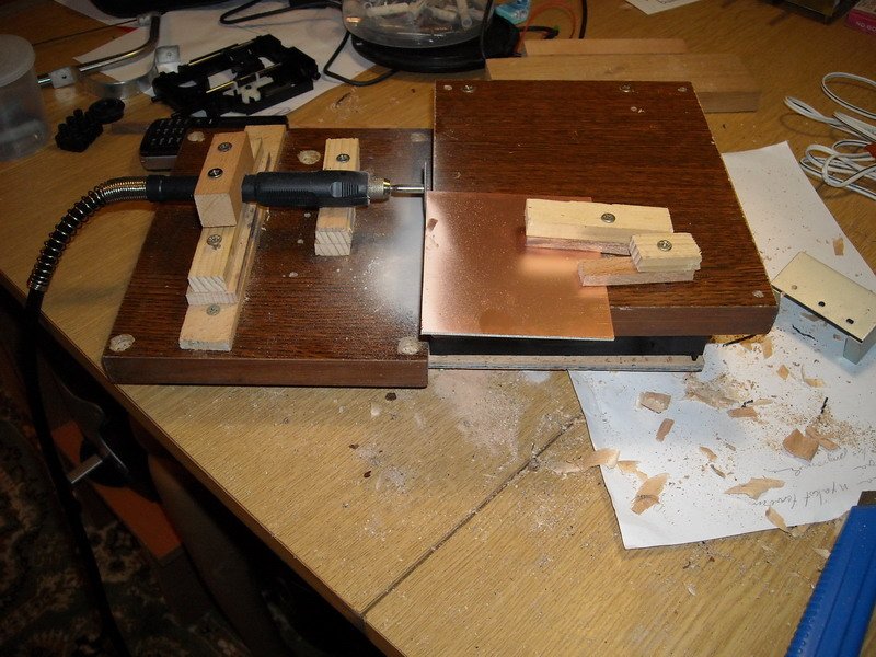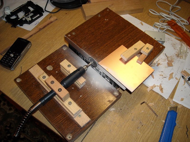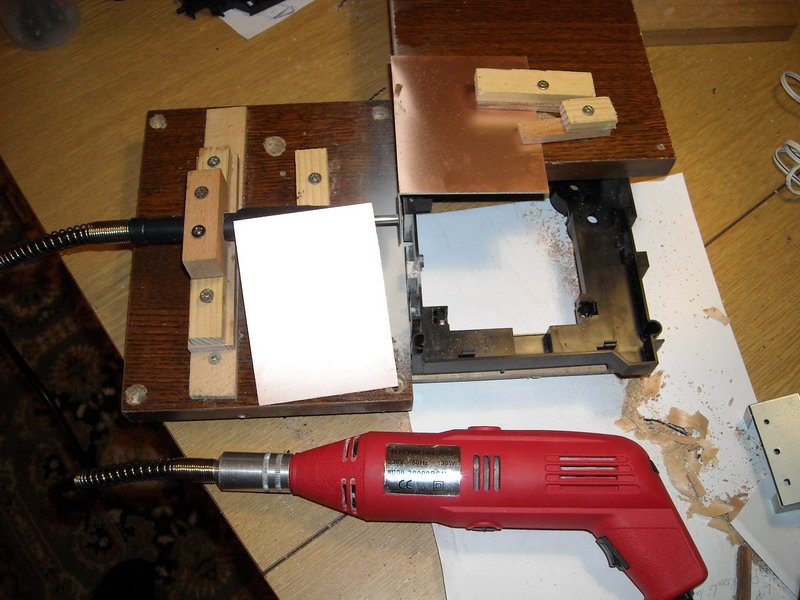 Mostantól ezzel aprítoma nyákot. Némi fa hulladék egy Mini Drill és egy kivénhedt CDROM összetákolásából megszületett.