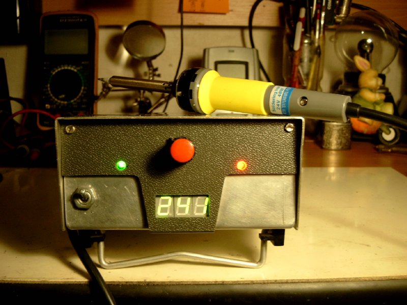 Sikerült megepitenem egy forraszto allomast. Az egyszerübb panelkivitelt valasztottam underspeed 3v3 as t. Voltmerö modulnak öszeraktam egy ösregi c520d ic n alapulo kapcsolast,abbol az egyszeru okbol hogy az ic es a nyak mar par eve pihent a fiok aljan, igy elhataroztam hogy megnezem mi lesz ha öszerakom es kiprobalom. A szabalyzo egyseg eleg jol muködött elsöre,viszont a led eleg gyorsan villogott miutan elerte a bealitott höfokot,ami bezavarta a voltmeröt,ezert kicsereltem a 470 ohm os ellenalast 4,7k ra. Most kb 1 villanas /masodperc,es nem zavarja a voltmeröt se. Volt ezenkivül nem keves szorakozas a modulok bedobolozasaval, 24voltos trafo tekercselesevel,meg meg jo par aprosaggal. Az elektronika szinte 100% ka bontott alkatreszböl van par dolog kivetelevel,ide ertve a pakat is ami vadonat ujj,es 4 es labkiosztasu csatlakozoval van ellatva(cb radiokon hasznalatos tipus). Reszemröl elegedett vagyok a müködesevel es köszönetet mondok mindazoknak akik hozzajarultak es leközöltek sajat fejlesztesü keszülekeiket,nem sorolom fel Öket,hiszen mindenki tudja kikröl van szo! Minden tiszteletem ezek a töbnyire fiatal emberek elött, akik a mai minden keszen vilagba ezt a hobbyt valasztottak, az eltaposodott töbseggel ellentetben!