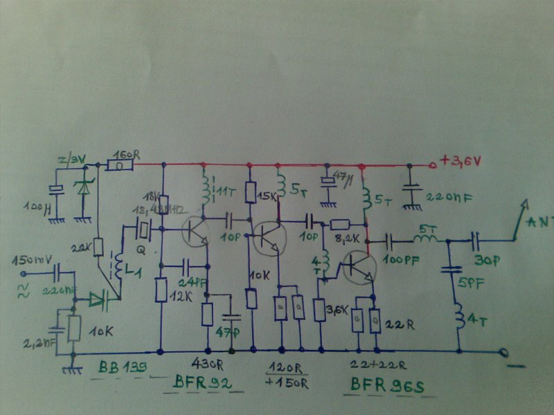 Már hogyne volnának tekercsadatok,a fetes változatnál CCir-sávra oszcitekercs 8T=menet csat.tekercs 4menet 0,65Cu-z ból 4mm.belső átmérőn.lazacsatolással tekercsek egymás mellett a panelon,nem érnek össze.Menetek kissé széthúzva,ne hogy túl gerjedjen BF961-es.A tranzisztoros 166Mhz-es nél mint a rajzhoz odaírtam BFR92-oszcitekercs 4mm.csévén 11menet/0,5Cu-z,2-3-ik fok.kollektortekercsei 5menetesek 3,5mm.0,65-0,75Cu-z-ból készítve.Vékonyabb huzal nem szerencsés sávszélesség/mechanikai tulajdonságok miatt.Aki látott már gyári 2M.sávra adóvevőt tudja miről van szó.