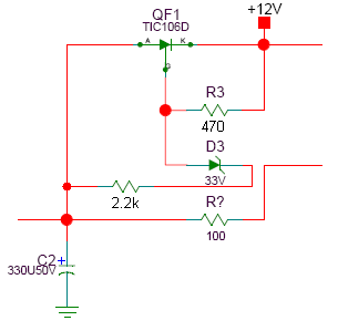 Gondolom a 33V-os zener jó. Ezesetben tirisztorcsere az eredeti tipusra,vagy például 2P4M-re (gondolom olyan sincs). Vagy átkötöd a 33V zener katódját a 330 µF pozitivjára,de eléje köss egy 2.2k ohmos ellenállást. A katód gate közt hagyd meg a 470 ohm-ot.