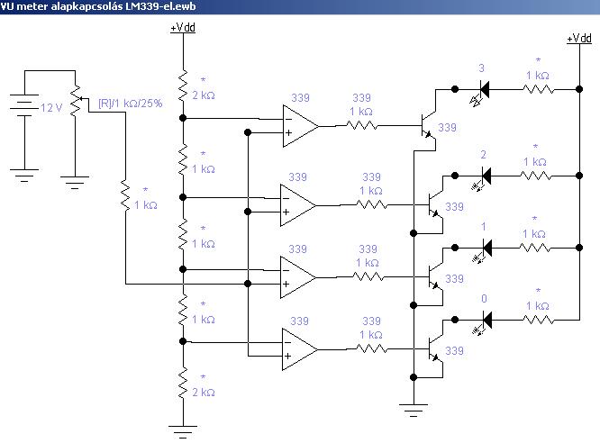 Idézet: „es az LM339N es integralthoz nincs rajzom!” S hogy ez ne okozzon problémát! Összedobtam egy vázlatot. A csillaggal jelszett alkatrészeket az alkalmazott tápfeszültséghez és a bemenő jelhez kell méretezni... S a LED-ek és tranzisztorok közötti kötéspont az IC kimenete lenne. A IC tápfeszültség pontjait értelemszerüen kell bekötni. De a megadott alkatrészekkel és tápfeszültséggel is működőképes a kapcsolás. Ezt a rajtot és az LM339-es adatlapját együtt nézve sok kérdés megválaszolásra kerül...