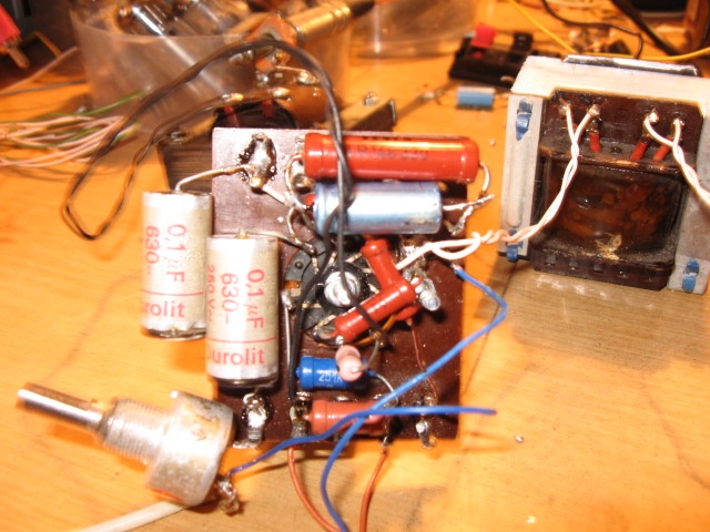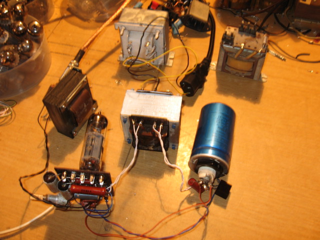 Sziasztok : Ma délelőtt pakolgattam a műhelyemben , és találtam a lomok között egy pár hálótrafót és picike kimenőket . Ezekből gondoltam valamit talán lehet csövezni ? A trafók között volt egy 210 volt DC / 6.3 DC, és ehhez kerestem itt a fórumon egy kapcsolást . Ez egy ecl82 se Így ezt próbáltam összekalapálni . Hát mit ne mondjak harmadik nekifutásra sikerült brummentesre összerakni! Úgyhogy a multkor elég bátor voltam amikor azt gondoltam , hogy a Gu -ut majd élesbe fogom összerakni ? Ezt a picike erősítőt kipróbáltam több kimenővel is ! A TV -ék ben használt sortrafóval is , ezzel nagyon nagyot ! megdöbbentően szólt a mély !Most maradt benne valamilyen rádióból kibelezett kimenő , ennek volt a legjobb az áttétele a csőhöz. Bár én már igencsak elszoktam a csöves hangzástól ,de azért szinte egész délután halgatóztam .Az első megitélésem hogy a mélyek valami félelmetesek , tiszta közepek , nekem talán a magas lehetne több , de viszont elegendő! Nos egy kis tanulmánynak azért jóvolt ez a kisérlet , így hogy már vagy 20 szép éve nem foglalkoztam csövekkel! Végülis ezen fölbuzdulva tovább kutattam még a félrepakolt alkatelemek közt és máris találtam még a folytatáshoz : pcl86 sztereó se hez cuccokat .
