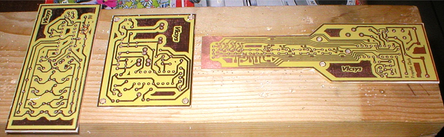 A megvilágítás: 1db 80W-os higanygőz lámpa búra nélkül-3,5-4 perc. Az előhívás gyári hívóval dupla töménységgel, ecsettel masszírozva. Maratás hiperol+sósav. Csatoltam a propeller clock nyákkészletét. A legujabb verziómnál az smd alkatrészek között is megy át 0,2-0,3 as vezetőcsík.