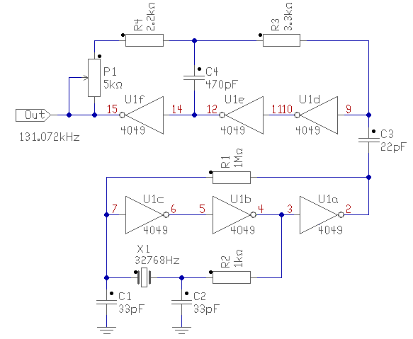 A 32768-at esetenként elég nehéz berezgetni. Esetleg próbáld meg egy műveleti erősítővel, vagy 339-es komparátorral. (Az 1Mohm helyett is legalább 4,7Mohm-ot kell használni.) De akkor már miért nem egy magasabb frekis kavicsot járatsz és osztod le a megfelelő frekire? A kétszerező után a freki ugyan kétszeres lesz, de a kitöltés messze nem szimmetrikus. Egy PLL vagy FLL kapcsolás, talán sokkal precízebb, vagy ésszerűbb lenne. üdv! proli007