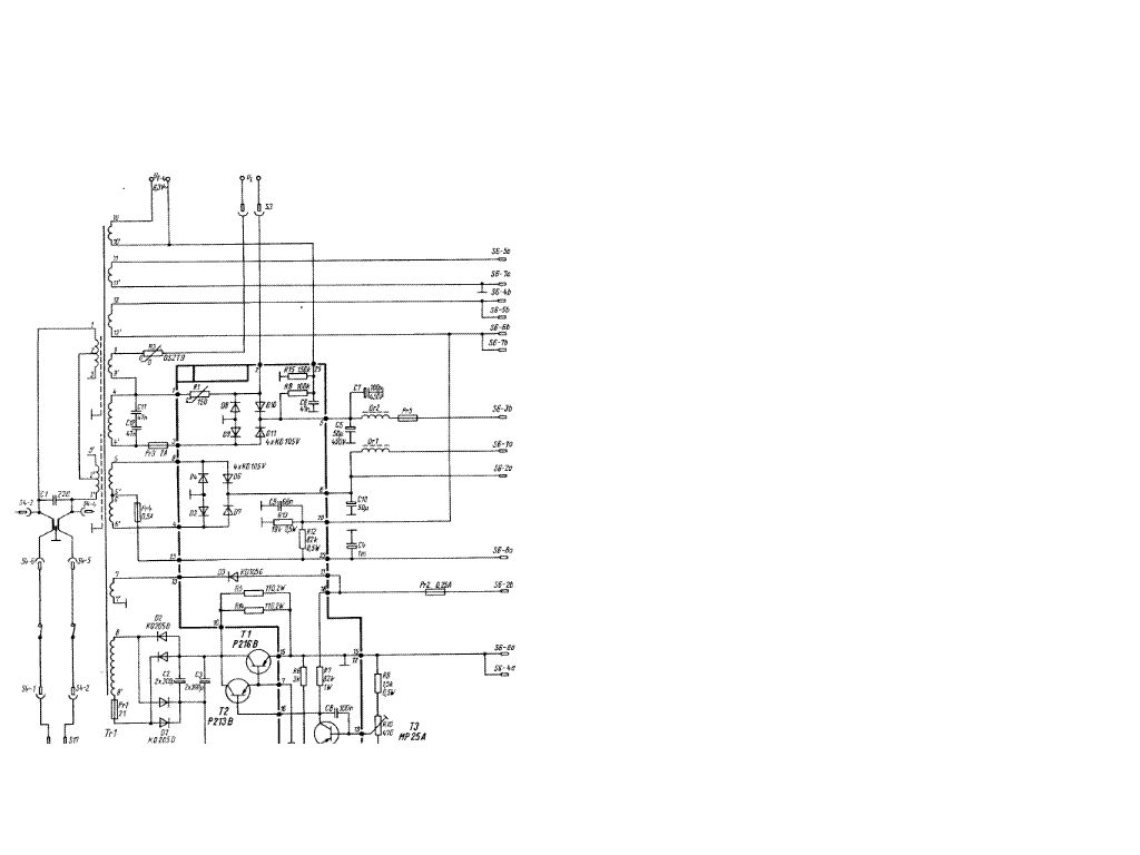 Hát, ez bizony az a ruszki trafó, amiről Sturbi beszél. A hibrid színesekben használták ezeket valamikor. Az oroszok kizárólag 6,3V-os csöveket használtak, azért van rajta 6,3V. Volt a készüléknek félvezetős része is, ennek az alacsonyabb feszültségű tekercs. Van rajta több kiegyenlítőtekercs is, amit nem terheltek, csakis a két oldal szimmetrizálására szolgált. Ez a rajzon sincs feltüntetve.