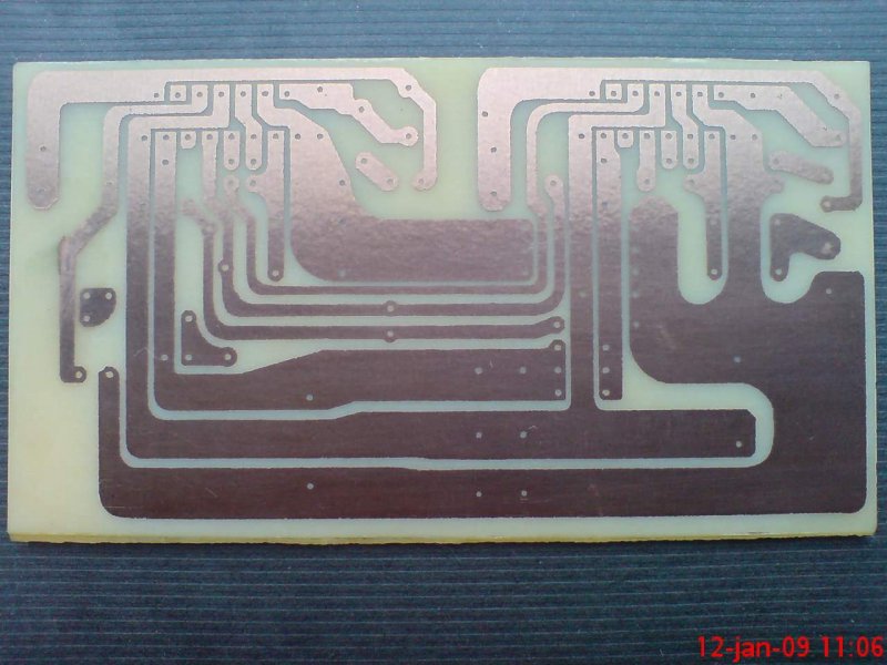 ![]() Egyebkent en azert csinaltam mert vettem nagyobb elkokat es nem fertek el rajta. A filces tecnologia levaltasara: En egyszeru feher nyomtato papirra kinyomtattam a rajzot sima tintasugaras nyomtatoval, aztan visszaraktam a nyomtatoba 2-3-szor es ilyen tobbszorosen nyomtatott papirbol is legalabb 2 reteget, hogy kelloen sotet legyen a rajzolat es ne szurodjon at rajta a feny. Aztan egymasra illesztettem a papirokat, bekentem etolajjal, ettol sokkal attetszobb lett ott ahol nincs rajta rajz, majd ra a lakkozott panelra, vilagitas, felesleges lakk oldas, maratas es kesz. Sajna a tobb retegu papir miatt a vilagitasi ido drasztikusan megno, de 1.5 ora vilagitas utan hibatlan az eredmeny Illetve nekem mindenkeppen jobban tetszik a vegerdemeny annal amit filccel rajzoltam.