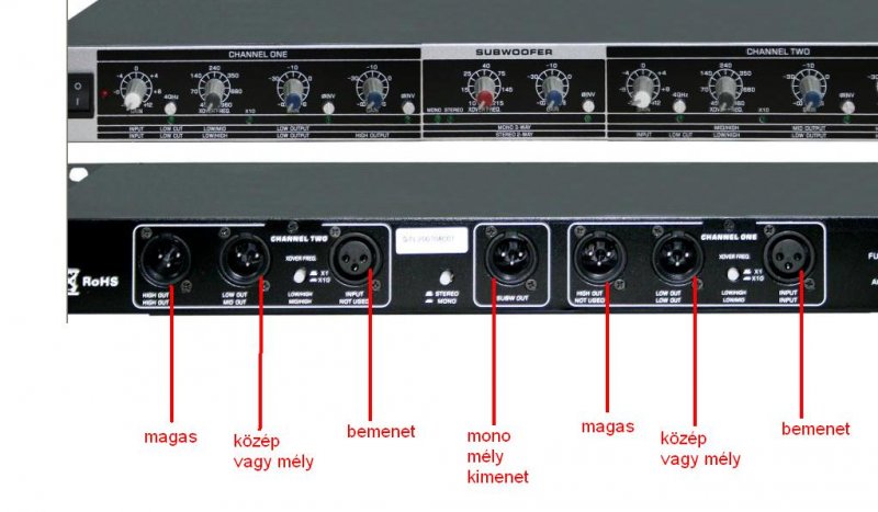 ez szerintem azt tudja,hogy a két csatornás (sztereo) bemenő jelet le tudod bontani egy közös szubwoofer jellre...és emellett mint egy sima EQ szabályzón keresztül van egy sztereo kimenet (két mono),amikre Te szabályzod mit akarsz küldeni. Ott van,hogy Low,Mid,High..a negyedik szerintem csak hangerő. A kis fehér nyomógombszerűségek szerintem többszörözők,ha valami túl kevés/sok volna.