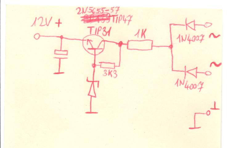 Remélem hapro javaslata beválik, de te plusz/minusz tápot említesz, ahhoz pedig két ilyesmi kell, sőt a másik oldalba fordított polaritású elemek kellenek. És még valami fontos!! Ha jól megnézed, ide a váltót kell kötnöd, ami csak 36V körül van, amit utána egyenirányít a dióda, és mivel neked mindkét oldal kell, így csak az egyik dióda szükséges oldalanként. Ami viszont csak a félhullámot engedi majd át, és ennek a furi jelalaknak egy része fog az 1k-s ellenálláson hővé alakulni. Utána a tranyó beállítja a 12-15V-ot, és csak ezután jön a puffer. (Nem ideális megoldás!!!) Alkotó