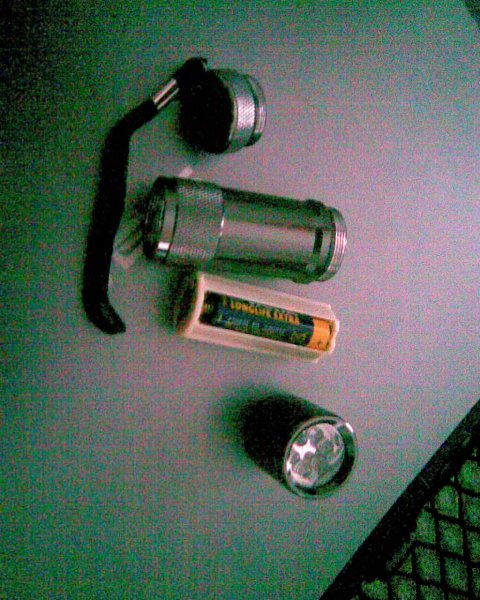 ma reggel sikerult osszeraknom a nagyobbik testvert is, kepek alabb. az also kepen a kulonbseg a 3mW HQ-s es az LG-bol operalt erosebb dioda kozott, a masodikon az egofoglalat, benne az elektronikaval es a diodaval, a harmadikon a lampatest.