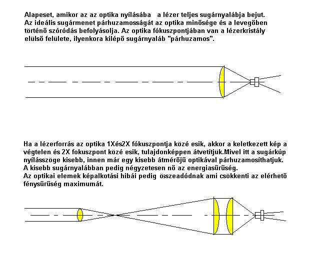 Tulajdonképpen ahányszor távolabb keletkezik a kép, mint az optika és a lézer közötti távolság, annyiszor nagyobb is lesz. Ha a lézecsip kilépő mérete "10X10"mikron, az optika fókusza 10mm akkor a legjobb esetben is 10 méteren már 1cm az egységnyi energiasűrűség pedig max.1/1 000 000 része. Itt jelentkezik a minél rövidebb fókuszú optika hátránya. Hosszabb fókusz esetén pedig a nagyobb átmérőjű optika képalkotási hibái okozzák a hátrányt. Igazán az átvetítés, vagy a fordított távcsöves párhuzamosítás adhat jobb megoldást.