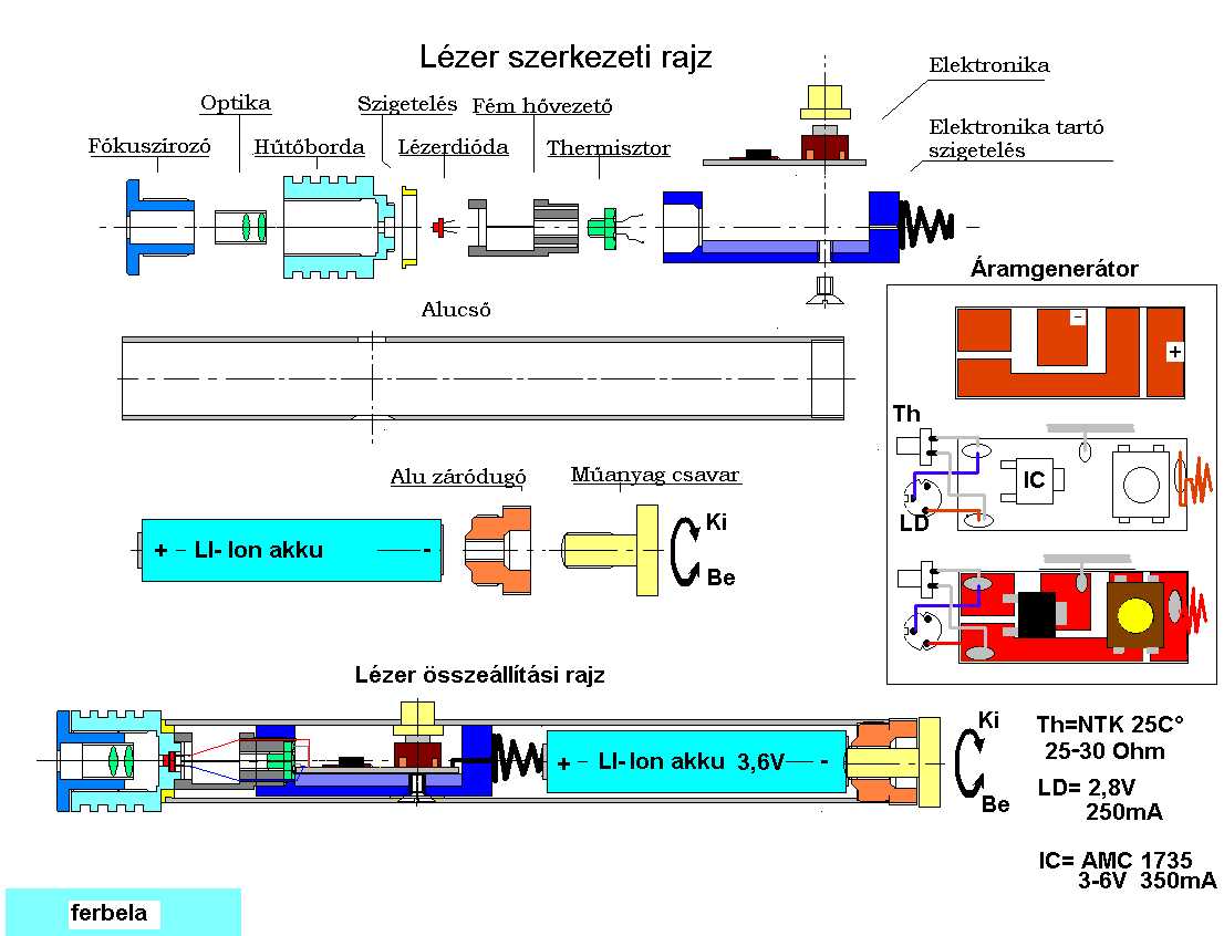 Még nem írtam a fórumra, de elég gyakran olvasom, és gondoltam, lesz olyan akit segít ez az ismertető. Kb. két hete kaptam 16X-osnak mondott DVD íróból kiszedett lézerdiódát.Mivel engem is nagyon érdekelt a téma, megcsináltam belőle ezt a pointert. Az elkészült darab 20mm-es alucsőbe lett beépítve, nagyon jól működik, és nagyon erős! Mivel fókuszálkató, a gyufát 2,5m-ről 5mp alatt meggyujtja, a barna hullámpapírt is megégeti. Tehát, csak óvatösan! A rajzot szándékosan nem méreteztem, mert ki-ki saját lehetőségei szerint építheti utána. A rajzon szereplő IC fix 350mA-es áramgenerátor, ezért tettem vele párhuzamosan a thermisztort. Ha valaki, csak 2db AA, vagy AAA elemről akarja működtetni, akkor sok minden elmaradhat, de javaslok egy 3,3 Ohmos ellenállást sorbakötni, hogy az áramfelvétel ne haladja meg a 300mA-t.