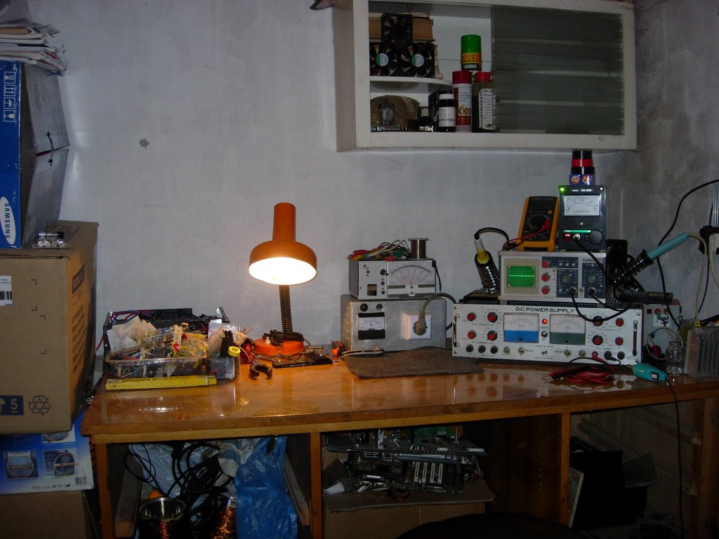 Eljött az ideje, hogy végre én is megmutassam a műhelyemet - annál is inkább, mert már bő fél éve foglalkoztat a gondolat, viszont egyszer sem volt olyan állapotban, hogy azt másoknak meg lehessen mutatni... Most nagyjából összesöpörtem a nagyja koszt az asztalról, a mindenfelé kallódó alkatrészek (kb fél kiló, de komolyan!) pedig az asztal bal oldalán látható átlátszó műanyag dobozokba kerültek. Igen, tudom, nem a legjobb megoldás, de amíg szét nem válogatom őket, addig úgy maradnak... ![]() A műhely többi részéről azért nincs még kép, mert ott családom egyéb tagjai is megfordulnak, tehát azokon a részeken sajnos még mindig rendetlenség van... Egyébként ez egy fűtött szoba a pincénkben - így a műszerek sem fáznak meg ( ), na és persze én is szívesebben tartózkodom ott így tél idején is.A műszereket gondolom felismeritek majd - mindenesetre ami talán kevésbé beazonosítható, az a leválasztótrafó (egyetlen deprez és egy dugalj), illetve a tetején lévő soha be nem fejezett tápegység; továbbá az asztal bal hátsó sarkánál a Spafi-féle táp félkész doboza, az asztal jobb szélén pedig a hozzá való panelek és hűtőbordák (idő hiányában még nem kerültek végleges beépítésre). Bár így utólag megnézve a Spafis táp dobozából nem sok látszik, de nem is olyan érdekes, talán majd ha befejezem egyszer (június óta fut a projekt... ). Idézet: „abból nekem van 5 éves is,várva a válogatásra. ”Huhh, képzelem...