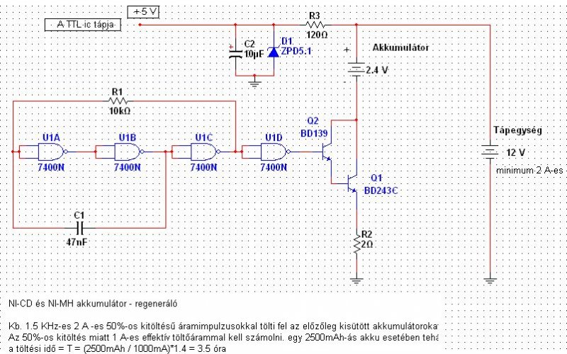 Bár a kisütés témakörben írtál, azért én mégis egy töltési módszert szeretnék mutatni. Velem és több ismerősömmel is előfordult már, hogy az akkumulátorok, amiket használtunk jócskán veszítettek az újkori kapacitásukból és szinte teljesen elfáradtak. Az ilyen esetek meglepően nagy hánydában, sikeresen alkalmaztam egy saját koncepciójú akkuregenerálót. A kisütött akksikat 2 A-es 1.5KHz-es áramimpulzusokkal töltöttem fel teljesen, majd újból ksütöttem. Ezt a ciklust az akkuk elhasználódási fokától függően többször(1-4) megismételtem egymás után. Alapos mérések és tapasztalatok után ki merem jelenteni, hogy szinte a teljes gyári kapacitásukat visszanyerték a rossznak, kukaérettnek hitt akkumulátorok. Sőt ma már az újan vett akkumulátoraim minden 10-edik töltését is így végzem(tehát 9 normál töltés és utánna 1 regeneáló töltés). Az áramkör egy egyszerű áramgenerátor, amelyet egy SN7400-as NAND kapuramkörrel felépített 50%-os kitöltési tényezőjű multivibrátor kapcsolgat kb. 1.5 KHz-el. Az effektív töltőáram így 1 A (350us ig 2 A folyik majd 350us ig 0 A). Ezek az értékek 1500mAh - 2800mAh-ás akksiknál megfelelőek, kisebb kapacitásúaknál az R2 ellenállást 4 ohmra kell növelni így az áramértékek a felére csökkennek. 12 V-os tápfeszültség mellett maximum 4db sorbakapcsolt cella tölthető. Az ember általában nem sokat törődik az akkumulátorok helyes kezelésével, csak beteszi a töltőbe, ha üres ha nem, és várja, hogy feltöltődjön. Egy darabig megy a dolog, aztán már egyre kevésbé. Ekkor a legtöbben rossznak gondolják kidobják és vesznek egy újat, én meg elkérem a régit "nekem még jó lesz" felszólalással. És általában tényleg jó is lesz.