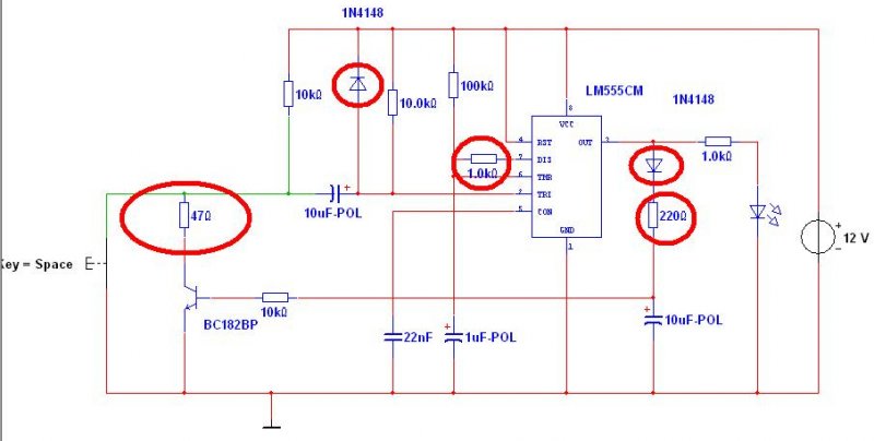 A tranyóval soros47 ohm a 10µF kisütésekor korlátozza a kialakult áramerősséget,elhagyása esetén nagyobb kapacitásoknál tönkre is teheti azt. Az 1N4148 szintén a 10µF miatt van. A kapcsoló,illetve a tranyó nyitása után a 10µF negativ pólusa is kezd a 10 kohmon keresztül pozitivabb lenni, igy a pozitiv pólusán is emelkedik a feszültség,dióda nélkül kialakulna egy kétszeres tápfeszültségnyi tüske,igy viszont csak tápfesz+~0.6V jelenik meg a pozitiv kivezetésen. A szimulátorban köss ide szkópot és meglátod miről irok.