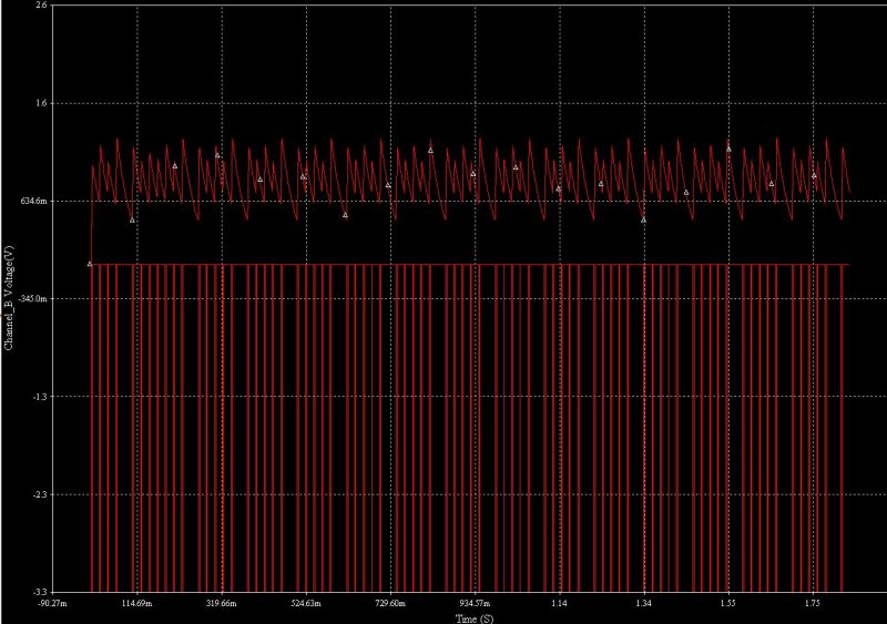 Ez a verzió felel meg a legjobban. Bár a szimulációban ha a kimenet és a dióda közé ellenállás kerül akkor a képen látható dolog történik! A másik képen pedig az ellenállás nélküli helyes működés látható. Valóságban nem vettem észre semmi változást. Azért ha valakinek van magyarázata esetleg megoldása azt szivesen hallanám. Aki pedig hibát találna a rajzban az is feltétlen szóljon! Mindenkinek köszönöm a segítséget!!!