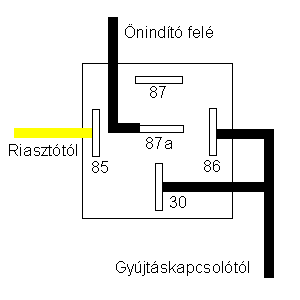 Az indításblokkot meg a rajzon látható módon kötném be. Ehhez el kell vágni a gyújtáskapcsolótól menő vezetéket és közbe kell iktatni a relét. Így csak akkor húz meg a relé, ha a riasztó be van kapcsolva, és a indítózni akarsz.