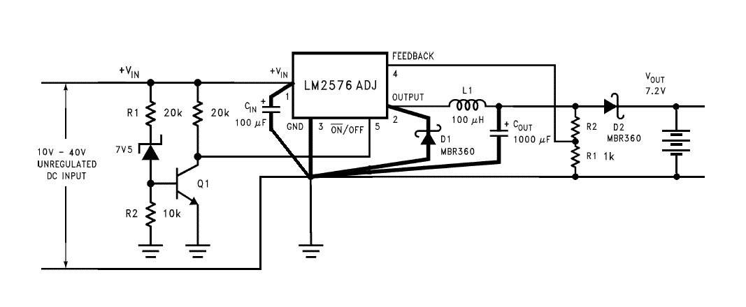 A te rajzod is jó, csak a kimenetére kell egy diódát rakni, az R2-öt cseréld ki egy potira, hogy be tudd állítani az akkun a 13.6V-ot!