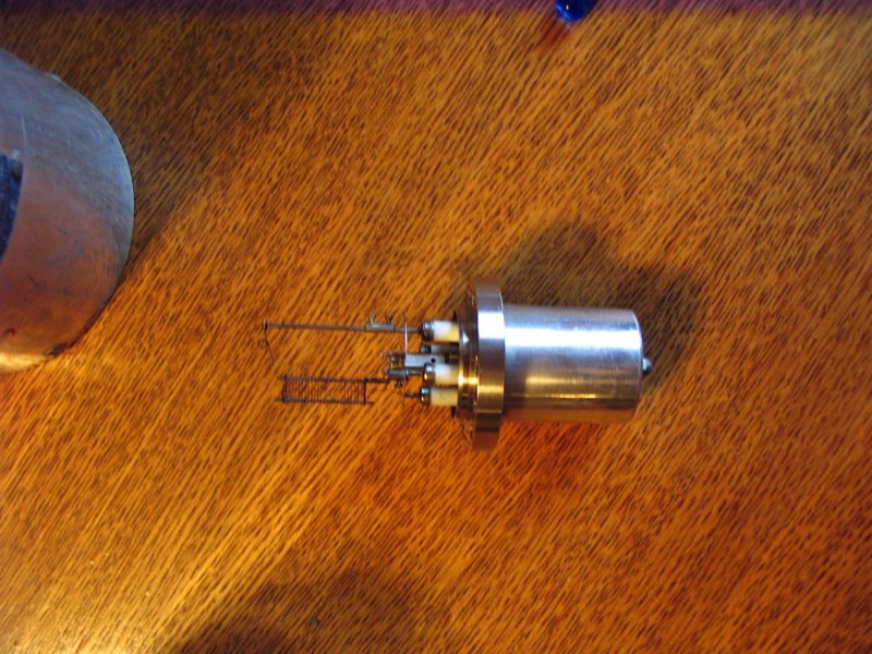 A felépítése egyszerű egy olan trióda, ahol a rács közepén van az az ionkollektor: egy vékony drót, és kívül a sima wolfram katód. Bármily óvatos az ember , sikerül a katódot kinyírni, eleve olyan a konstrukció, hogy 0.12 wolframdrótból 10 perc alatt új katódot varázsoltam. lefényképeztem nem tudom hogy látszik, ja meg az edwards