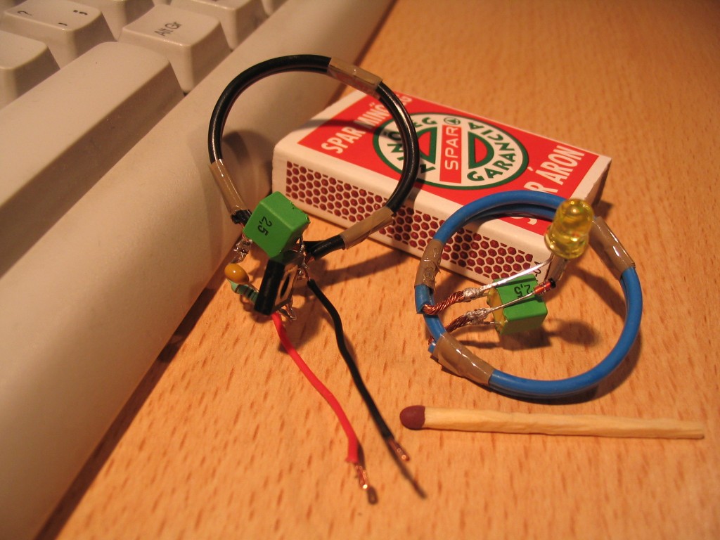Valaki korábban írta (Skori?) hogy a tekercs átmérője minimum 3,5 cm legyen. Mivel kisebb pohárba is szeretném elkészíteni a gyertyát, úgy gondoltam hogy kipróbálom mennyire használható így. A mellékelt képeken látszik, hogy ilyen kis tekercsekkel is tökéletesen működik. Csak a 4,7nF-os kondi fólia, a többi kerámia. A 470pF helyett 220pF-ost használtam mert csak ilyen volt itthon ![]() 4,5V-ról működtetve a 2 centis asztallapot simán átviszi, de ha még egy pohárba is belerakom, akkor már csak akkor világít szépen, ha a pohár pont az adó felett van. 6V-ról hajtva egy kicsivel fényesebben világít és nagyjából a tekercs méretével azonos területen mozgatva a fényerő nem változik érzékelhető módon. A tranzisztor az utóbbi esetben sem melegszik. Mellékelek pár fotót, amin a méreteket egy gyufásdoboz, a hozzá nem értésemet meg a gyatra minőségű forrasztások szemléltetik