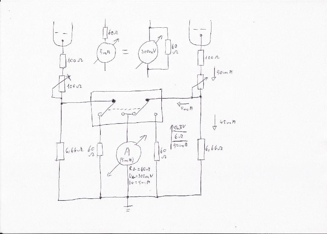 Nem 1 ohmos mérőellenállást kell használnod, hanem 6,66 ohmosat, és a műszer átkapcsolásakor a műszer helyett be kell kapcsolni egy 60 ohmos ellenállást, kompenzálandó a műszeren folyó 5 mA-t, hogy pontos katódáramot mutasson 0-50 mA-ig.