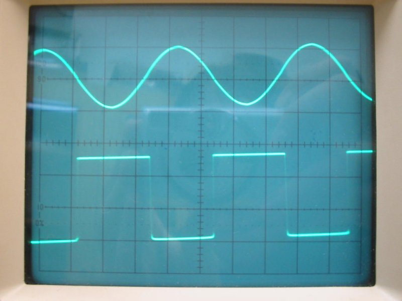Üdv! Gulyi valamit elhibáztam a logikai ic-kkel majd csütörtökön folytatom vele, de azonban a jelformáló része gyönyörűen müködik első kép a tranyó kollektorán mérve, második a tranyó bázisán. A fölső szinusz volt a bemenő jel, négyszög és fűrész jel esetén is szép négyszög lesz a tranyón!