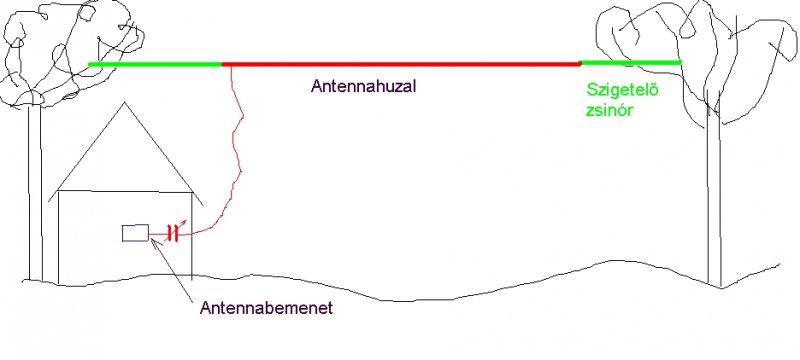 A végeit bármilyen 1-2 méteres műanyag zsinórral (damil, műanyag ruhaszárító kötél) elszigetelheted a kikötéstől. Az antenna lehetőleg legyen minél távolabb bármilyen vezetőképes testtől (fa, épület stb.), és legyen minél magasabban. A vezeték szigetelése nem elég, ne csavard pl. fára a szigetelt antennahuzalt se.