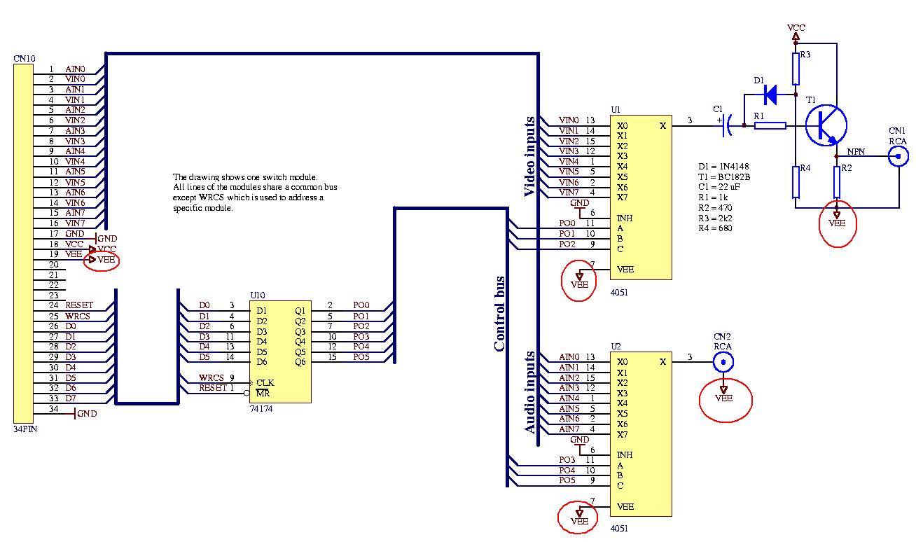 Találtam egy kapcsolást, ami audio és video jelet kapcsol 4051-es ic-vel. Azt szeretném megtudni egy hozzá értőtől, hogy a rajzon szereplő video kimenet és audio kimenet RCA csatlakozóinak a test pontja miért a 4051-es VEE lábára van kapcsolva. Illetve a video és audio bemenetek test pontját szintén a VEE lábra kell csatlakoztatni? Bővebben: Link