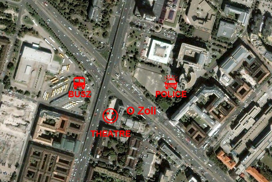 Menjen fel egyenesen a buszpályaudvarra és onnan már látja a színházat a túloldalon, ha balra fordul. Ezután visszamegy és a jobboldali első feljárón feljön. Arra nem emlékszem, hogy fent van-e zebra a Váci úton, de mintha valami rémlene, mert a felüljáró alatti parkolóba is oda lehet menni valahogy. Vagy kérdezze meg a járókelőket, hogy merre a színház. A Róbert K. krt. több feljáró is van.