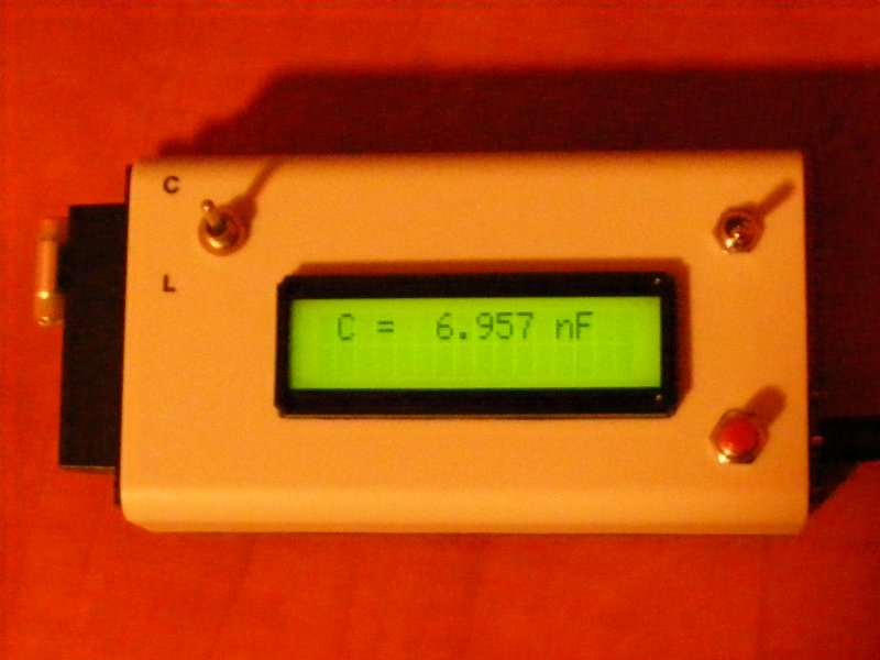 Elkészült a komplett készülék, meg vagyok vele elégedve. Az is nagy előnye, hogy ha van egy etalon értékű mérendő alkatrész, akkor hozzá lehet pontosítani a készüléket. Ajánlom mindenkinek megépítésre. Jó tanácsként csak annyit, hogy minél rövidebb vezetékeket használjunk a kapcsoló illetve kijelző bekötéséhez is. Végezetül itt van néhány kép a készülékről. Egy 6.8 nF-os kondi a mérés tárgya. Sok sikert a megépítéshez!