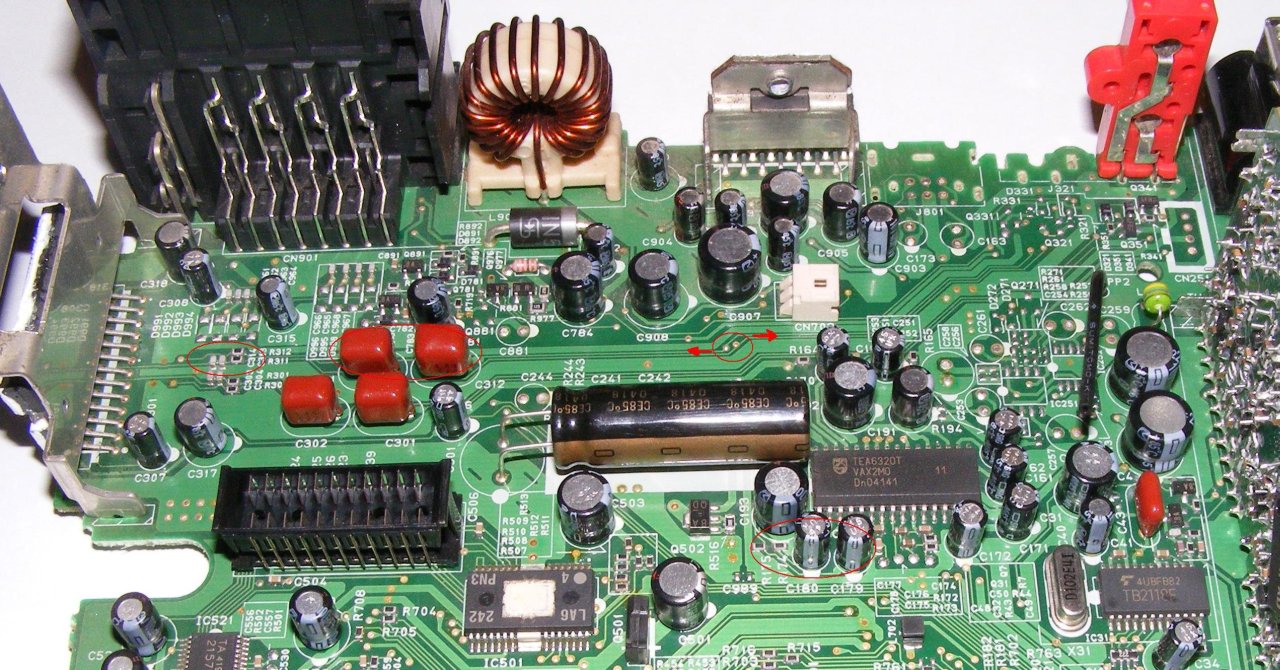 Na szia! Végig követtem az útját, annak amit mondtál. Amit pirossal bekarikáztam a tranyoknál az megy az IC hez. A másik kettő pedig a mélynyomó kimenethez. Azt is pirossal bekarikáztam jobb oldalt, a nyák túloldalán oda csatlakozik a pár RCA a mélynyomónak, erősítőnek. Az IC-n is bekarikáztam a bemenetet. Rádió üzemmódban, ha id raktam a jelet, akkor a hangszóró csak zúgott, és folyamatosan kilengett, azaz olyan volt mintha jó nagy DC-feszt ráraktam volna. De mikor CD üzemmódba kapcsoltam, még csak ez sem történt meg, a hangszóró nem mozdult ki. Az IC előtt különben van pár ellenállás, meg kondenzátor, ha azok elé raktam a jelet, akkor szólt a zene, nemcsak búgott, CD üzemmódban, viszont semmi.(bekarikáztam azt is, a felülnézeti képen, hogy hova raktam a jelet ekkor) Ötlet van még?