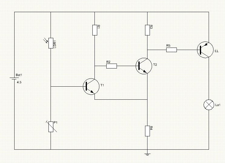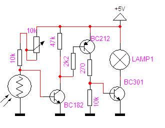 Megfelelő megvilágítás hatására a BC182 kinyit, ezzel a PNP tranzisztor bázisát föld felé húzza, így a PNP tranzisztor is kinyit, ezzel a BC301 megfelelő bázisáramot kap és vezetni fog. Szerintem nem ezt akartuk elérni. Egyszerűbb lenne a BC301-et kicserélni FET-re, ha van otthon (első szembejövő alaplapról lehet letermelni logikai szinttel vezérelhető kockát), amivel akár 1MOhm is lehetne az alkalmazott ellenállás, ezt már leírtam. Fényérzékelőt is talán ki lehet váltani LED-del, de ezt is írtam.