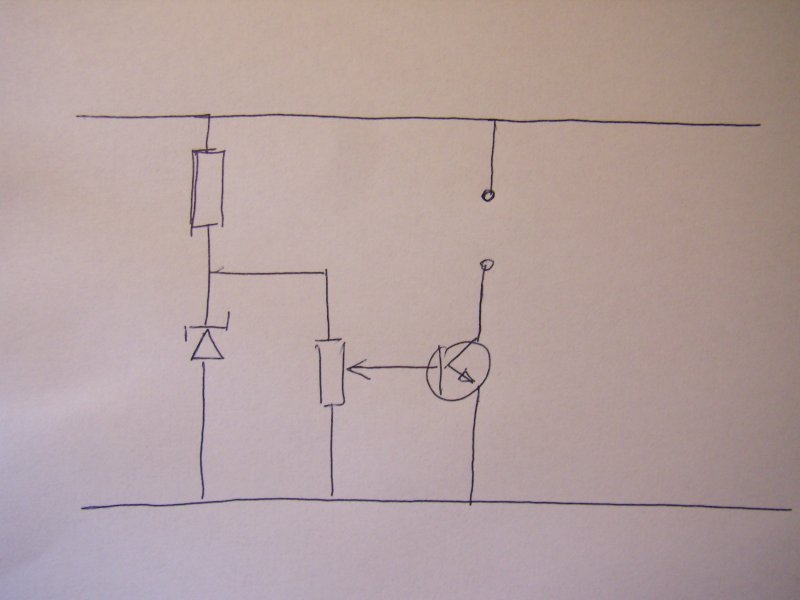 Na készitettem egy rajzot , bocsi hogy kezzel csak nem akartam értékeket adni meg ilyenek mert nem ez a fele a hiba a rajznak, mármint terhelésnél kitűnően. Ugyanakkor ami rajzot küldtél annál az emiteren van a terhelés. Most egy kérdés hogy hogy is van az akkor hogy a tranzisztor kollektorl laba feszültséget mig az emiter lába emitert szabályoz, ha úgy kötődik be. És mint mondtam a lehető legegyszerűbb kapcsolásra gondolok mint a rajzon láthatod. Ugyanakkor ugyis igy csinál ha stabilizált labortáppal vezérlem a bázist. És ha emiterrel vezérlek akkor mar sokkal jobb a hleyzet ugymond mert teher hatására csak 0,4 voltot esik kb a beálitott tehermentes állapothoz képest. Szóval akkor hogy is érthető pl az én rajzomra a visszacsatolás? Vagy akkir mi a megoldás hogy a beállitott feszültséget tartsa mint egy LM317? persze tudom hogy annak az áramköre jóval bonyolultabb. Az az ötlet hogy terhelő ellenállás mennyire használható pl ha a kimenő feszültség változik, vagy az én lehető legegyszerűbb kapcsolásomra mondj valami megoldást légyszives. Persze még ezt is lehetne egyszerűsiteni csak egy potira és tranzisztorra