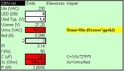De már kijavítottam, és meg is építettem a saját LED-es lámpámat a javított számítás alapján, és hibátlanul működik, a feszültségek és az áram is mindenhol annyi, amennyinek lennie kell. Csatolom a javított képletet. Minden esetre elképzelhető, hogy nem teljesen pontos (a fázistolások miatt), de közelítőleg teljesen ok, lemértem. (+-2mA nem számít) A Tesztlámpámban 8 LED van sorosan. Csatolom a kapcsolásomat is. Az alkatrészek értékei a lámpámnak megfelelőek. |