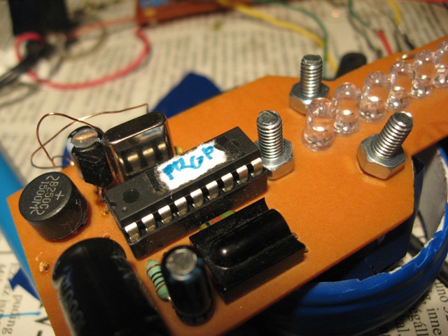 Én így csináltam:Az első led van a középpontban,tehát azt nem forrasztottam be,és a led két lába közé fúrtam mégegyet.Felfűztem egy jó erős pecazsinorra,és a zsinórt kifeszítettem.Így lehet látni hogy melyik fele a nehezebb.Persze a pic felőli oldalra a nyákra forrasztottam egy csavart,és rá egy anyát csavartam.Ezzel már egészen jól ki lehet egyensúlyozni. Az igazság az,hogy ez a kiegyensúlyozás eléggé nagy szopás,és eltart egy darabig Úgyhogy türelem!Még annyit, hogy a gombok 0-15-ig vannak számozva,nem 1-16-ig! Üdv!