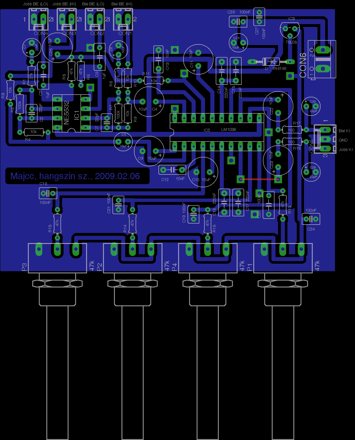 Merítettem belőle jó ötleteket. "hangszín beállítások majd mindig elmásznak" Mitől mászna el, ha a 7805 stabil 5V-ot álít elő a 12V-ból. A dióda még egy kicsit tol rajta felfelé. A 17-es lábon a zener feszültség pont ekkora, és onnan vannak meghajtva a potik. Szóval szerintem elég ötletes, mert nehéz átvezetékelni az 5V-ot a 17-es lábtól. Így sokkal kényelmesebb a potik bekötése és funkcionálisan ugyan az. Tetszik a kis jel nagy jel lehetősége is. Szóval elég jó ez a kapcsolás.