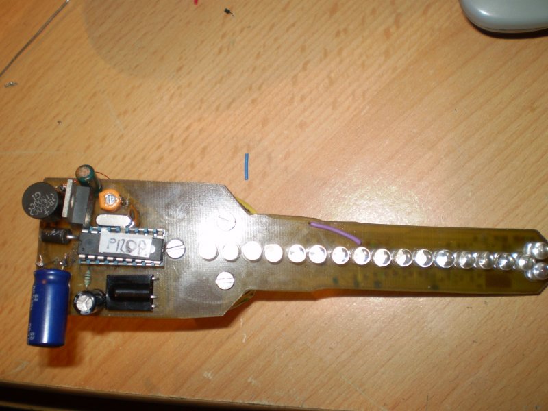 Én így csináltam:Az első led van a középpontban,tehát azt nem forrasztottam be,és a led két lába közé fúrtam mégegyet.Felfűztem egy jó erős pecazsinorra,és a zsinórt kifeszítettem.Így lehet látni hogy melyik fele a nehezebb.Persze a pic felőli oldalra a nyákra forrasztottam egy csavart,és rá egy anyát csavartam.Ezzel már egészen jól ki lehet egyensúlyozni. Az igazság az,hogy ez a kiegyensúlyozás eléggé nagy szopás,és eltart egy darabig Úgyhogy türelem!Még annyit, hogy a gombok 0-15-ig vannak számozva,nem 1-16-ig! Üdv!
