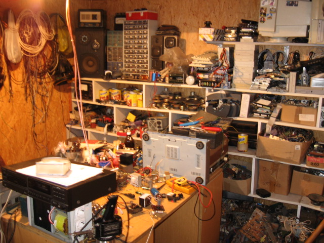 Íme az én kis műhelyem. A pincében egy sarokban lett kialakítva. Az alap műszereim megvannak: multiméterek: (3db), páka, tápegység, szkóp. És persze a fiókok tele vannak új és használt, szépen dobozokban rendszerezett félvezetőkkel, kondikkal, ellenállásokkal