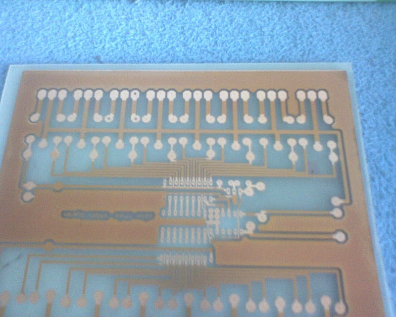 maratás után egy másik fóliát használok amin csak a forrszemek átlátszóak és így előhívás után azokon nem marad lakk , majd a vezetőkön fenthagyott lakkot hőlégfúvóval" beégetem" és eztán jön a fúrás beültetés